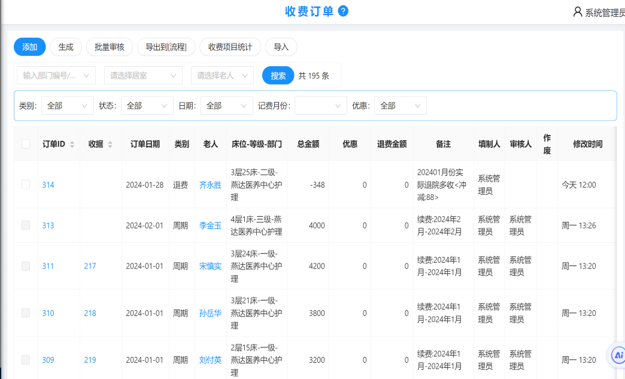- 欠费统计可随时查询欠费的老人.